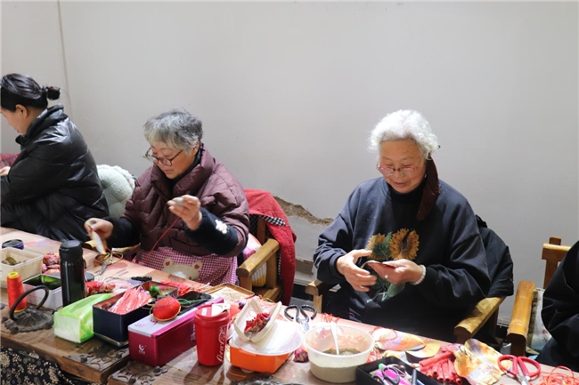 村民于马庄香包生产车间进行香包的缝制